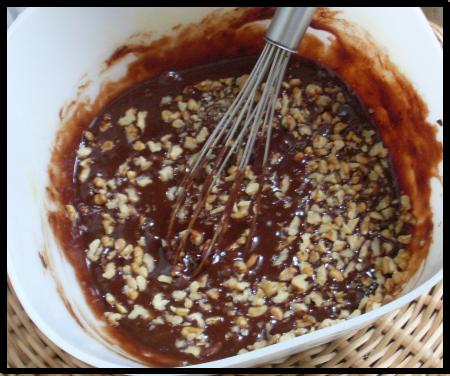 Type : Dessert Préparation : 25 minutes Cuisson : 35 minutes Pour : 6 personnes - 230 g de chocolat noir à 70% de cacao - 120 g de cerneaux de noix - 50 g de farine - 150 g de beurre fondu - 160 g de sucre - 4 oeufs Concassez le chocolat en petits morceaux, puis faites-le fondre au bain-marie sur feu doux (j'ai ajouté une noisette de beurre pour être sûre qu'il ne cuise pas). hachez les cerneaux de noix. Dans un saladier, mélangez la farine tamisée avec le beurre fondu, le sucre, puis les oeufs. Incorporez alors le chocolat fondu et les cerneaux de noix. Versez la préparation dans un moule beurré (elle doit atteindre 3 centimètres d'épaisseur), lissez la surface et enfournez une trentaine de minutes.