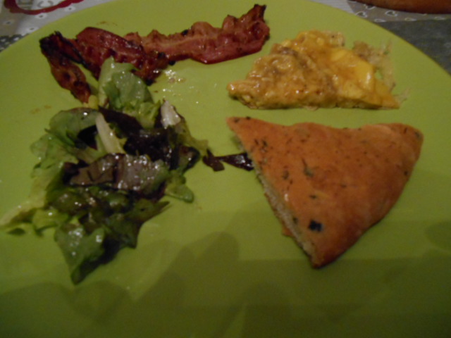 1/2 cube de levure 250 gr de farine 130 gr de lait 2O ge d'huile d'olive 100 gr d'olives noire dénoyautée 5 gr de sel,herbe de provence Ds le bol du TM 5 mettre la levure,lait 2' 37°/Vit 2. Ajouter la farine,l'huile,sel,olives. Mode épi 2'30. Former une boule et repos 1h. Poser sur une plaque lui donner une forme aplatir, faire des entailles et badigeonner d huile d'olive et des herbes de Provence. Garnir d'olives noire. Laisser lever 20' Préchauffer le four à 230° et cuire 2O' Avec une omelette, lard à poêlé,salade vinaigrette et un morceau de fougasse.
