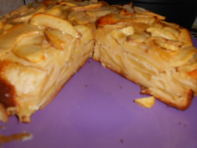 6 pommes 4 oeufs 100 gr de sucres 200 gr de lait 40 gr de beurre fondu 1 sachet de sucre vanillé 140 gr de farine 1/2 sachet de levure chimique Mettre tout dans le bol et mixer 5'/Vit 5 Ajouter le beurre fondu et mixer 2'/Vit 10 Eplucher les pommes et coupez les finement Les déposez les sur un papier sulfuriser beurrer Verser la préparation sur les pommes