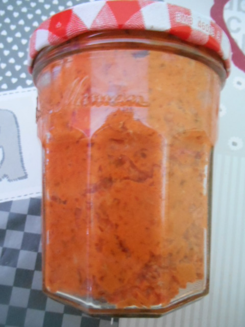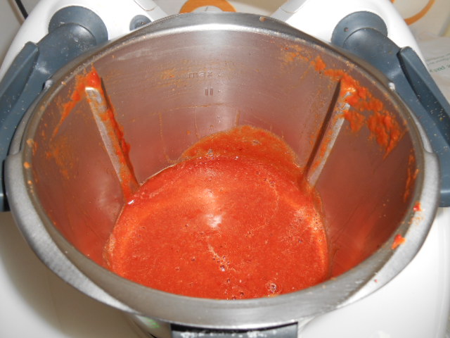 300 gr de concentré de tomate 60 gr de sucre 125 gr de vinaigre 100 gr d' eau 1 pt oignon rouge 1 c à c sel 1 pt c à c de paprika 1 pincée de pient d' Espelette TT mettre dans le bol 5' 100° Vit2