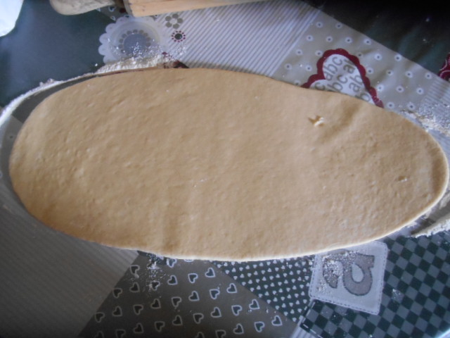 Mettre le lait, le beurre, la levure, le sucre dans le bol, et chauffer3'/37°/Vit 2 Ajouter la farine et le sel, pétrire 3'. Mettre à lever 1H Tapisser une plaque de papier cuisson et réserver diviser la pâte en 3 et rouler chaque pâton.