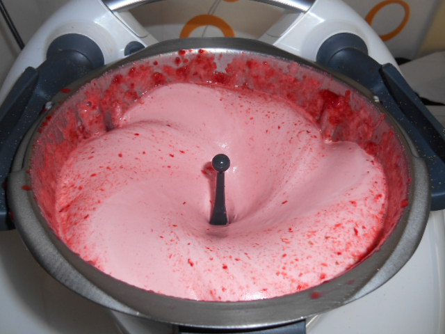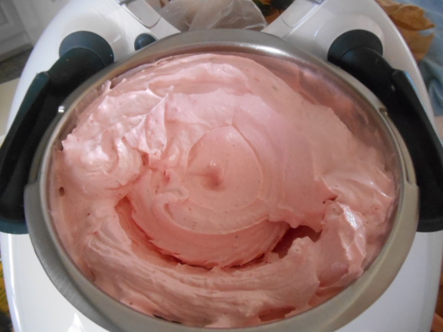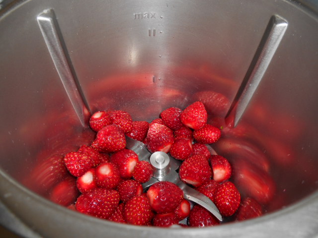 Mettre le sucre dans le bol, et pulvériser 15 sec/Vit 10 Ajouter les fraises, le jus de citron et le blanc d' oeuf, et mixer 40 sec/Vit 5 Insérer le fouet 3'/Vit 3,5