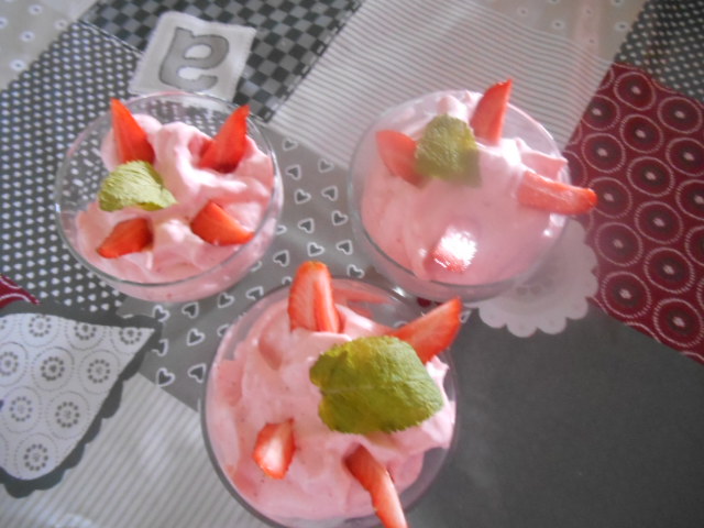Répartir dans des coupes à dessert, garnir avec des morceaux de fraises et feuille de menthe.