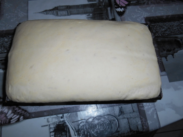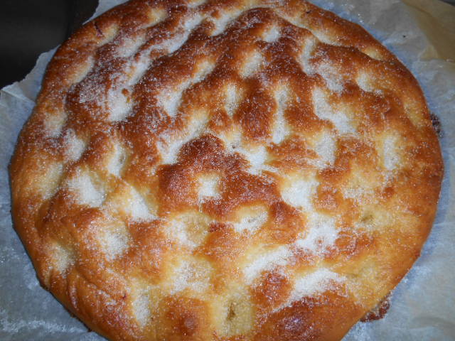 Pâte briochée 90 gr de beurre 150 gr de lait 15 gr de levure fraîche 2 c à s de sucre 300 gr de farine 1 oeuf 2 pincée de sel Mettre dans le bol le beurre,lait,sucre,levure et programmer 3'/37°/Vit 2 Ajouter la farine,sel et l'oeuf et pétrir 5' mode épi. Verser la pâte dans un moule a tarte recouvert d'un papier sulfuriser et bien étaler la pâte. Laisser pousser la pâte pendant 2h près d'une source de chaleur. Dégazer la pâte légèrement du bout du pouce en appuyant dessus et faire des trous à intervalles réguliers. Garniture 1 oeuf 10 gr de crème liquide 10 gr de lait 50 gr de sucre cassonade 50 gr de sucre blanc Une dizaine de noix de beurre Dans un bol,battre l'oeuf,la crème liquide et le lait,les sucres. A l'aide d'un pinceau badigeonner le dessus de la pâte en veillant à bien remplir les trous. Parsemer de noix de beurre deci delà Pour terminer,soupoudrer légèrement de sucre blanc pour que le beurre s'imprègne également de sucre Cuisson