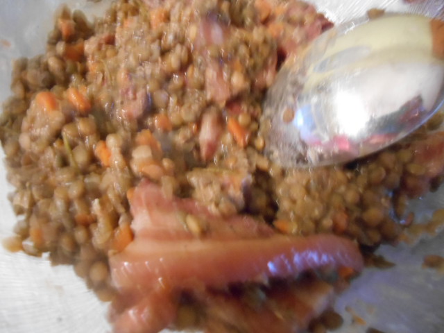 1 carotte 1 oignon 1/2 gousse d' ail 1 clou de girofle 150 gr de lentilles vertes 4 tr de lard salé Thym,romarin 1 feuille de laurier Sel,poivre 325 gr d' eau 1 sc de Morteau