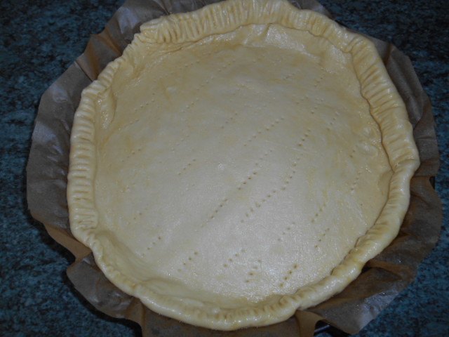 Déposer la pâte dans un moule, étaler à la main 3 mm d' épaisseur. Piquer le fond