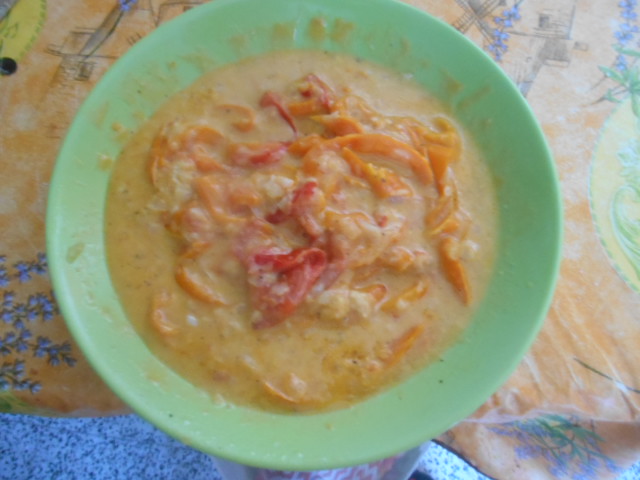 Moi j' ai accompagner de poivrons orange et une tomate. Dans le bol hacher, l' ail,l' oignon 7 sec Vit 5 puis racler les parois. Ajouter l' huile, faire revenir 5'100° à la cuillère. Couper les légumes saler, poivrer et programmer 30' 100° Vit cuillère. Ajouter le fouet pour garder les légumes en morceaux. |