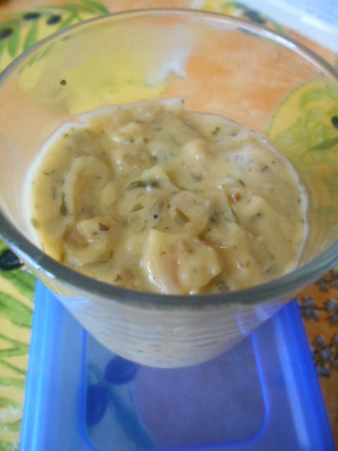 A faire la veille elle est meilheur au goût 1 jaune d'oeuf 2 c à s de vinaigre ou citron 1 gousse d'aïl écrassée 2 c à s de câpres 4 filets d' anchois 40 gr de parmesan râpé 180 gr d'huile Un peu de poivre et saler légèrement Suivre la recette de la mayonnaise du thermomix sauf qu' il faut broyer les câpres et les anchois avant d' ajouter les ingrédients. |