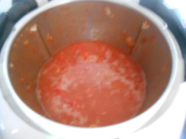 Mettre dans le bol,oignon coupé, l' ail et mixer 5 sec Vit 5. Racler les bords et recommancer l' opération. Ajouter dans le bol l' huile d' olive et faire tourner 3' à 90° Vit 1. Ajouter dans le bol les tomates, le concentré de tomate, le basilic, sucre, sel, poivre mixer 20 sec Vit 6. Programmer le bol 20' à 90° Vit 2.