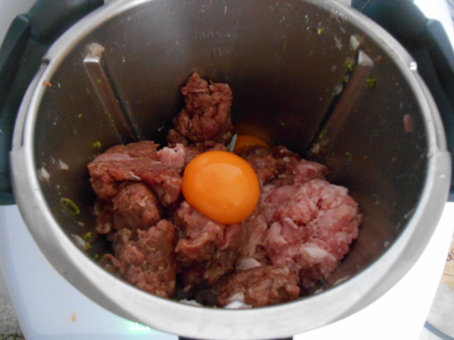 Mettre l' oignon dans le bol, et le persil, et haché 5 sec/Vit 5 Ajouter l' huile et risoler 4'/120°/Vit 1 Saler et poivrer et ajouter le Madère Ajouter la viande et cuire à 100°/40' /Vit C Avec un peu d' eau et 1 cube bouillon. Réserver dans un plat.