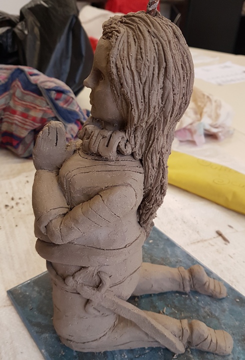 Nouvelle Sculpture en cours, Amanda Young de Saw, alias "Le cochon" dans dead by daylight. Je ne l'ai fais que jusqu'aux genoux, comme sur la photo, car la terre est fragile et les pieds ne tiendraient pas avec autant de poid. Déjà que je ne suis pas très sûre concernant les mains... ^^"