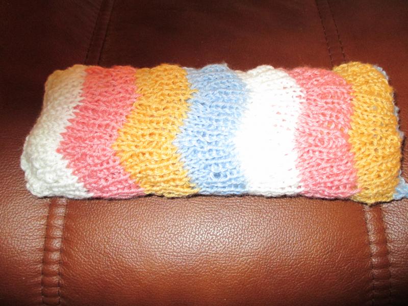 Comme j'aime beaucoup tricoter le soir devant la télé.... voici une couverture pour bébé confectionnée avec de la laine de récupération offerte par un ami !