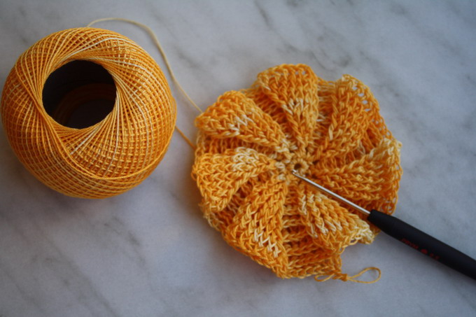 1 bd avant + 2 bd avant dans la 2ème bd avant en relief 1 bd arrière + 2 bd arrière dans la 2ème bd arrière en relief. Continuez en crochetant toujours 2 bd dans la dernière bd soit avant soit arrière (augmentation). Vous aurez ainsi une m. de plus à chaque pétale, à chaque tour. Continuez sur environ 16 rangs, selon la taille désirée.