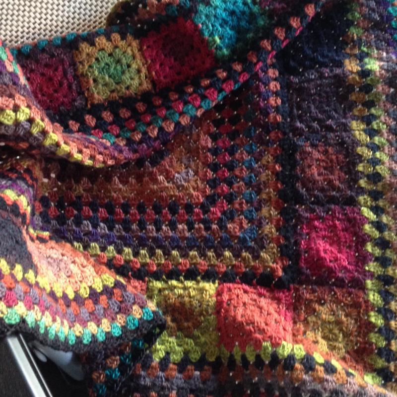 Je m'amuse énormément en crochetant une couverture à ma façon .....avec des restes divers de laine + quelques pelotes de Delight de chez Drops.