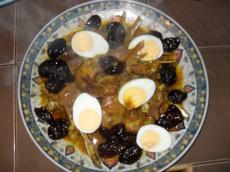 -1kg d'épaule d'agneau -1 ou 2 oignons -1 c.c. de cannelle -1 baton de cannelle -1c.c de gingembre -safran ou colorant alimentaire -sel -huile -pruneau -sucre -oeuf -amande(facultatif) Ajouter les épices et couvrir d'eau, laisser mijoter jusqu'à ce que la viande soit cuite, sur feu doux. A part mettre dans une casserole les pruneaux astuce prendre un peu de jus de viande rajouter du sucre en poudre et de l'eau laisser cuire attention pas tros car les pruneaux vont finir leur cuisson avec la viande. Cuire les oeufs durs. Une foi des pruneaux prêt les mettre dans la marmitte avec la viande et y verser un peu de jus de cuisson des pruneaux ce qui donnera le bon gout sucré. Pour le dressage mettre la viande des pruneaux et les oeufs . |