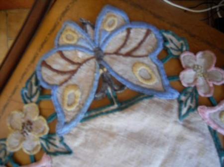 Ma semaine a été assez dure. Maman est tombée dans son jardin. Elle à juste une plaie à la jambe heureusement ) Elle habite en ville mais à un peit jardin séparé par des bordures en ciment faites par mon père il y a bien longtemps. (je lui avais pourtant défendu de monter dans le jardin ) Comme elle n' a plus trop le sens de l'équilibre elle est tombée (elle aurait pu se cogner la tête) C'est son aide ménagère qui m'a prévenue Donc médecin, infirmière, pansements pendant vingts jours. Je l'ai également emmené chez un dermatologue. Elle à un petit bouton sous l'oeil. J'ai aussi aidé mon fils.En faisant "le livreur d'un magasin à l'autre) Suite à le tempête il rachète du matériel d'occasion ou fait refaire des moteurs électriques (en attendant une hypothétique aide gouvernementale) En ce moment les huitres ne se vendent pas (suite à la découverte d'une bactérie) Heureusement pour lui la saison est terminée car il ne vend que sur Paris pendant 6 mois. Mais pour la plupart des autres ostréïculteurs c'est encore un coup dure Donc je n'ai pas fait beaucoup de cuisine Je vous mets un petit napperon que maman m'a donné pour le nettoyer. je le trouve très joli. Elle l'a fait il y a bien longtemps Je vais maintenant regarder vos blogs Bisous |