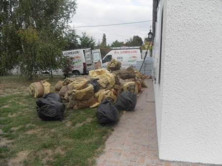 Il a fallu enlever la vieille laine de verre, tous le foin et les nids que les oiseaux avaient ammacé depuis toutes ces années '( les sacs noirs sur la photo) Et oui il ya eu trente ans en juin dernier que mon mari et moi avions fait construire cette maison A la place de la vielle laine de verre les ouvriers ont pulsé avec un gros appareil un produit isolant. J'espère que cela va faire baisser ma note d'électricité...!!! car une maison neuve c'est bien mais fatalement au bout de quelques années certaines choses doivent être changées.ou tout du moins entretenues.Quand au gazon il n'a pas souffert il n'est pas encore reverdi. Bisous Bon week end Ginette |