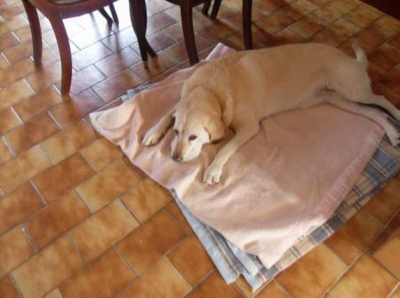 J'ai donc leur chienne en garde . Comme d'habitude ils ont oublié son panier..!! heureusement j'ai toujours 3 petits plaids pour elle. Elle est adorable. Les premières heures elle boude ensuite elle me fait la fête pour manger ou sortir. Demain je l'emenerais en promenade Bises Ginette |