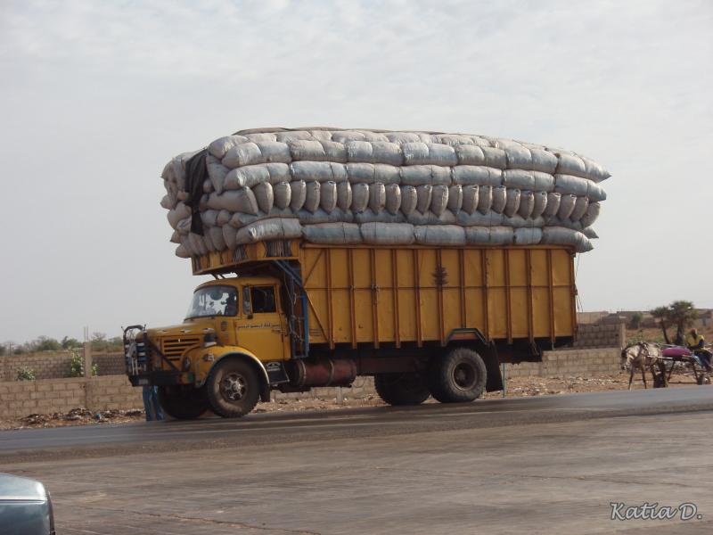 Une petite île située dans le Delta du Siné Saloum et classée au patrimoine mondial de l'UNESCO. Nous nous mettons donc en route et en chemin, nous croisons toujours ces camions avec des chargements incroyable ! Dans une bétaillère, un passager bien installé au dessus des bêtes...