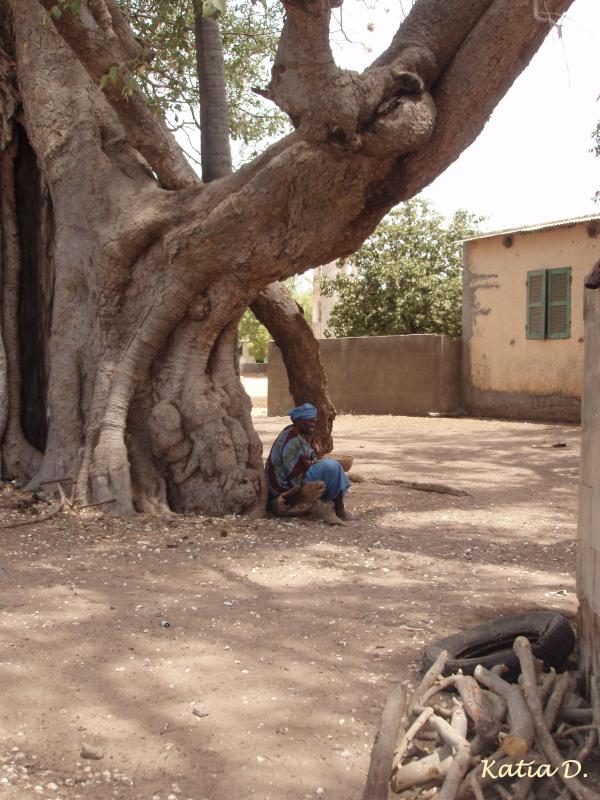 Ici l'arbre à palabre est un magnifique baobab. Le fruit du baobab est le pain de singe et est utilisé notamment pour préparer un délicieux jus sucré !