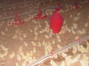 Les poussins arrivent à l'âge d'un jour. Ils sont déposés sur une litière de paille broyée à une température ambiante d'environ 30°, avec de l'eau et de l'aliment à volonté pour leur assurer un bon démarrage.