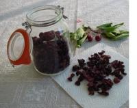 Pour la consommation des cerises séchées ci-dessus, il suffit de leur redonner leur humidité, en les trempant dans de l'eau (1 volume d'eau pour 1 volume de fruits) pendant 3 à 4 heures. (temps à surveiller, pour qu'ils ne soient pas trop mous)