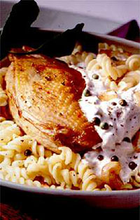 Si je peux me permettre, ce mets est d'un goût délicat, le poivre vert rehausse les suprêmes sans leur faire perdre leur finesse tandis que le piment, aïe! Quel dommage! |