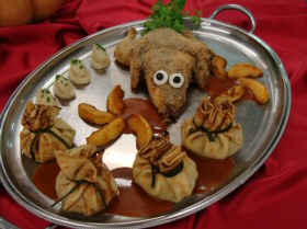 - Après avoir réchauffer la garniture, dresser les coquelets en plat (1 coquelet pour deux personnes), adjoindre un peu de beurre noisette, et un cordon de sauce autour.