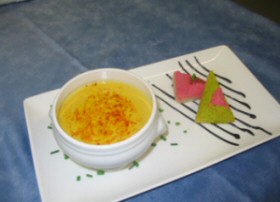 - Dresser la crème en bol, saupoudrer de rizdor ou de safran. Ajouter un peu de caramel et une châtaigne entière
